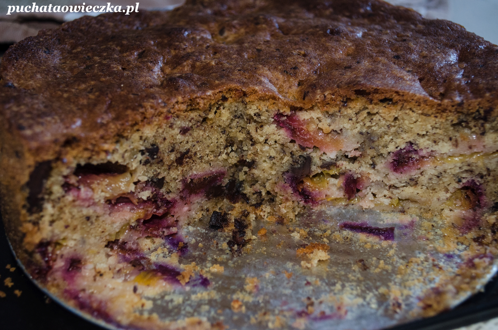 Zanim zaczęłam przygotowywać ciasto – pokroiłam śliwki, posiekałam czekoladę i zmieliłam orzechy. Następnie mąkę przesiałam razem z proszkiem do pieczenia. Do misy miksera wsypałam cukier, wrzuciłam pokrojone na mniejsze kawałki masło i zmiksowałam na gładką, puszystą masę. Do masy stopniowo wrzucałam po jednym jaju, miksując po dodaniu każdego. Następnie wsypałam mąkę z proszkiem i wymieszałam szpatułką, dodałam czekoladę, orzechy i ponownie wymieszałam. Na końcu dodałam śliwki i znowu całość wymieszałam. Nie za długo. Tylko do połączenia składników. Ciasto przełożyłam (jest dość gęste) do wysmarowanej masłem tortownicy (w przepisie jest by wyłożyć samo dno papierem do pieczenia – mi się skończył) i wstawiłam do nagrzanego do 170 st. piekarnika. Czas pieczenia w przepisie to 45-50 minut. U mnie ciasto piekło się godzinę i 5 minut. Pieczemy do suchego patyczka. To zależy od Waszych piekarników, więc czas musicie sobie sami ustawić.